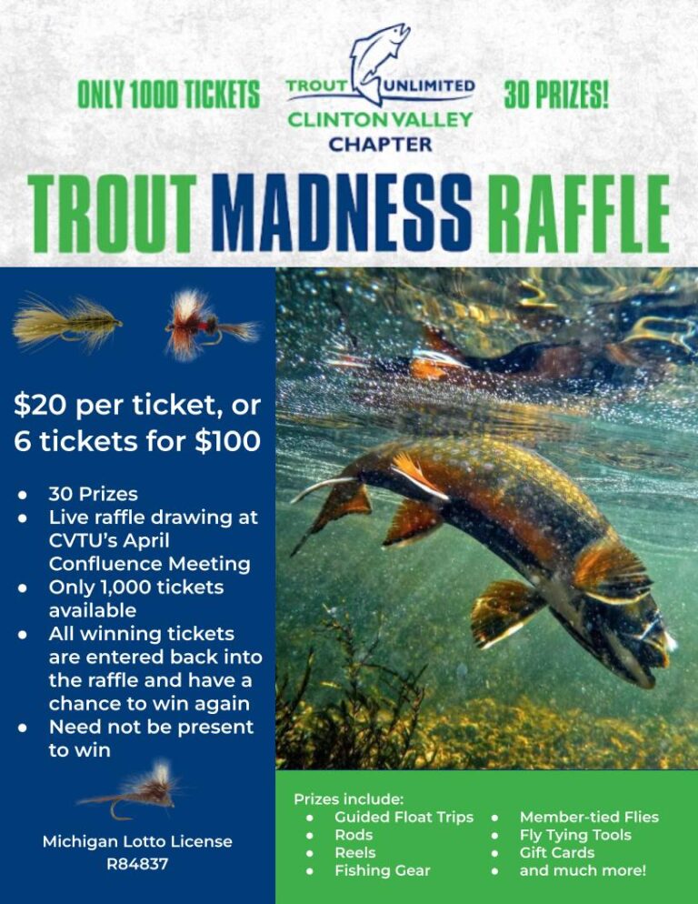Support local coldwater conservation in Southeast Michigan and enter to win big in CVTU’s annual Trout Madness Raffle. The Clinton Valley Chapter of Trout Unlimited works to restore and protect coldwater fisheries and their watersheds, with a special focus on the Clinton River watershed and our “gem” trout stream, Paint Creek—a rare naturally reproducing trout resource in a highly developed urban watershed.Ticket Options (30 Drawings)